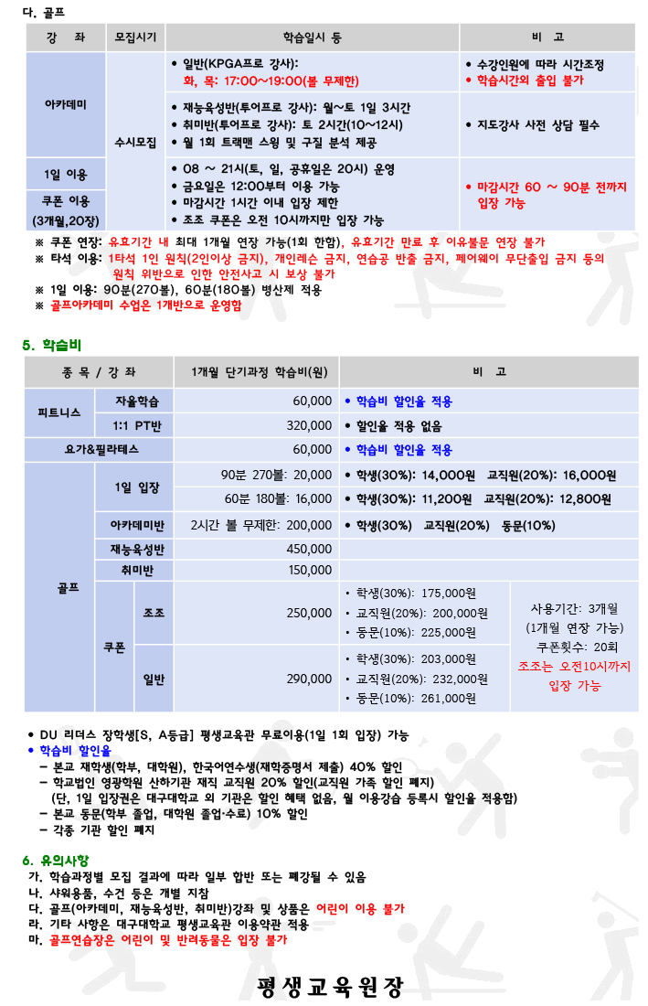 - 골프아카데미 1개 강좌로 운영( 화, 목 17:00~19:00)