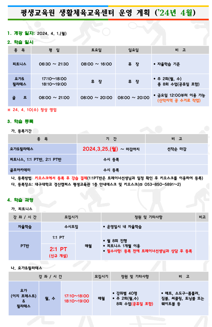 2024년 4월 생활체육교육센터 운영 계획(안)