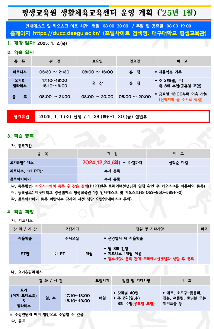 2025년 1월 생활체육교육센터 운영 계획(안)